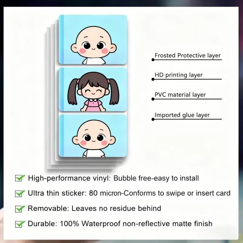 Δέρμα πιστωτικής κάρτας συνήθως κατασκευασμένο από υλικά όπως πλαστικό PVC, το οποίο είναι λεπτό, εύκολο στην επικόλληση και την αφαίρεση και συχνά διαθέτει αδιάβροχη και ανθεκτική στις γρατσουνιές ματ επιφάνεια για να εξασφαλίσει ανθεκτικότητα και μακροχρόνια εμφάνιση. Είναι αδιάβροχο, ανθεκτικό στο σκίσιμο και συμβατό με εκτύπωση UV υψηλής ανάλυσης.