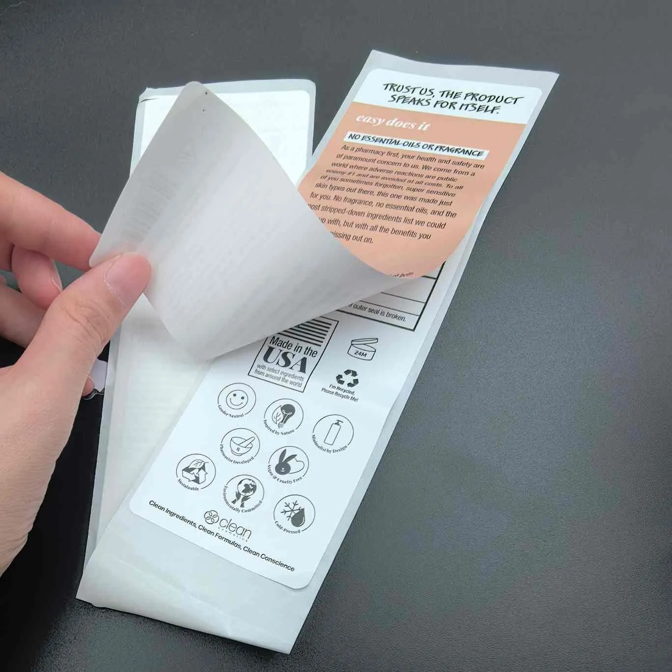 Ξεφλουδίστε και διαβάστε τις ετικέτες:Ο πιο βασικός τύπος, Ονομάζεται επίσης πολυστρωματικό για ετικέτες καλλυντικών. Το ανώτερο στρώμα είναι εύκολο να ξεκολλήσει και το εσωτερικό στρώμα περιέχει εκτεταμένες πληροφορίες. Χρησιμοποιείται συχνά για μάσκες προσώπου, ορούς και άλλα προϊόντα σε μικρές συσκευασίες.