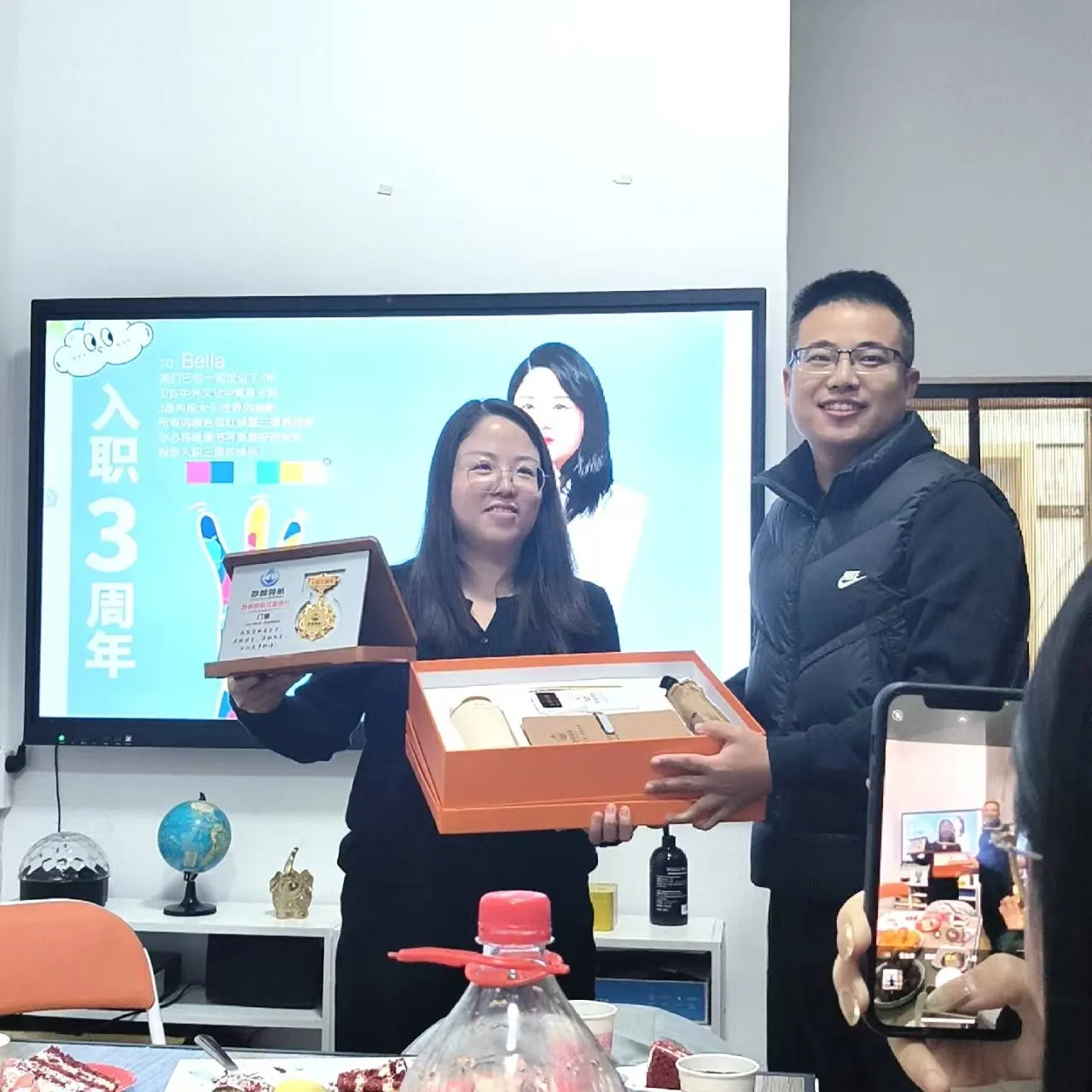 Ως μια υπέροχη έκπληξη, ο Boss Gao παρουσίασε επίσης προσωπικά όμορφα δώρα επετείου εργασίας στον Tom και την Ella και τον Manager Bella. Αυτά τα ειδικά διακριτικά αποτελούν μια ειλικρινή αναγνώριση της συνεισφοράς τους τα τελευταία χρόνια και φέρνουν τις καλύτερες ευχές μας για τη συνεχή ανάπτυξή τους με την εταιρεία.