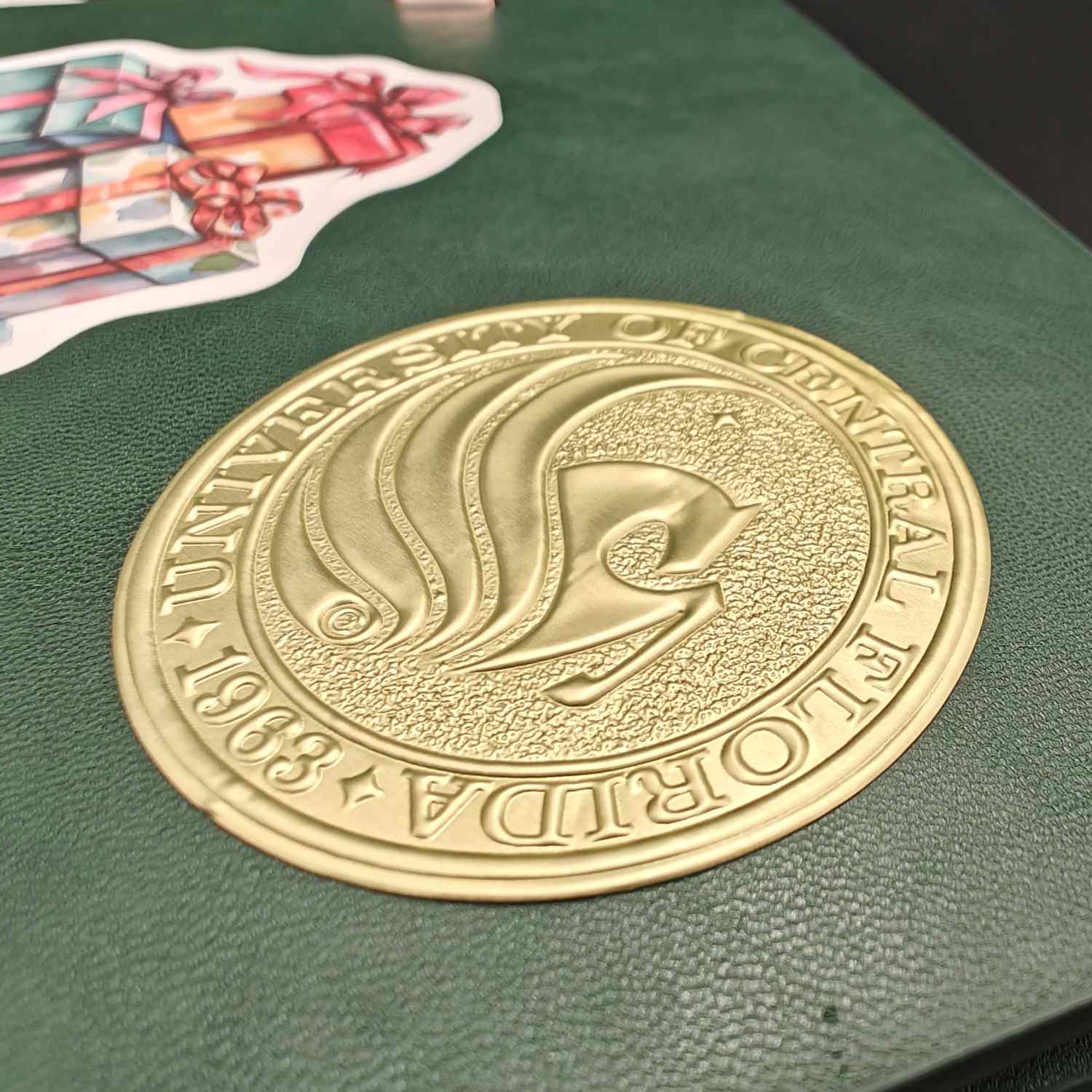 Οι ανάγλυφες ετικέτες κρασιού με στρογγυλό φύλλο είναι μια αυτοκόλλητη ετικέτα με κυκλική βάση, όπου το μεταλλικό φύλλο μεταφέρεται στην επιφάνεια του υλικού μέσω τεχνολογίας θερμής σφράγισης και στη συνέχεια τα ανάγλυφα σχέδια συμπιέζονται με χρήση κοίλων-κυρτών καλουπιών. Σαν ένα μινιατούρα μετάλλιο, η μεταλλική λάμψη και η τρισδιάστατη αίσθηση αφής της ετικέτας μπορούν να αναδείξουν αμέσως την αίσθηση κορυφαίας ποιότητας ενός ολόκληρου μπουκαλιού κρασιού, αφού στερεωθεί απαλά στο σώμα του μπουκαλιού.